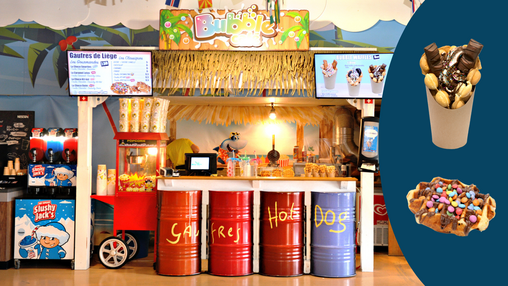 Choix sucré et salé avec : hot-dog, bubble waffle, pop-corn, boissons, glaces.