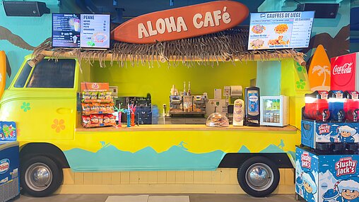 Besoin d'une pause après les toboggans ? Destination Sharkyland pour une collation à l'Aloha Café !
